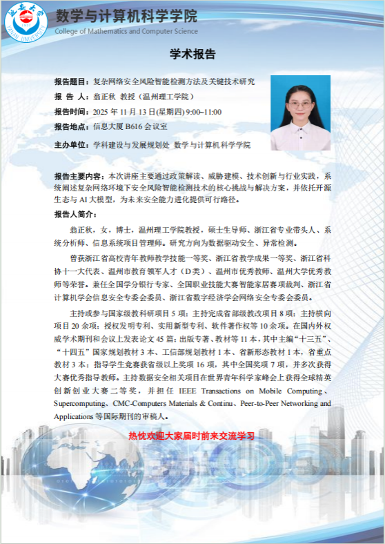 翁正秋,女,博士,温州理工学院教授,硕士生导师、浙江省专业带头人、系统分析师、信息系统项目管理师。研究方向为数据驱动安全、异常检测。